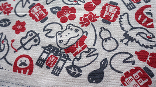 けろ吉と、雷門・鶴・だるまなど、縁起の良い模様のデザインです。