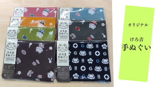 当店オリジナル けろ吉グッズをはじめ、今治や泉州のタオル・ハンカチ、